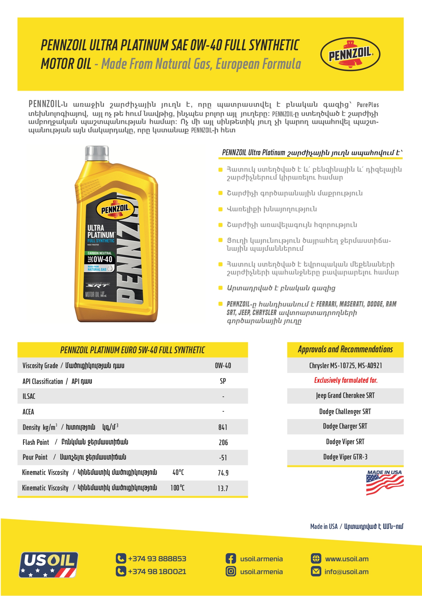 Pennzoil Platinum® Euro is designed for complete protection and performance for European vehicles. Pennzoil Platinum Euro helps extend engine life and protects for up to 15 years or 500,000 miles, whichever comes first. Guaranteed.4 Pennzoil Platinum® Euro is made from natural gas, not crude. Its base oil is 99.5% free from engine clogging impurities. The Proof is in the Pennzoil.